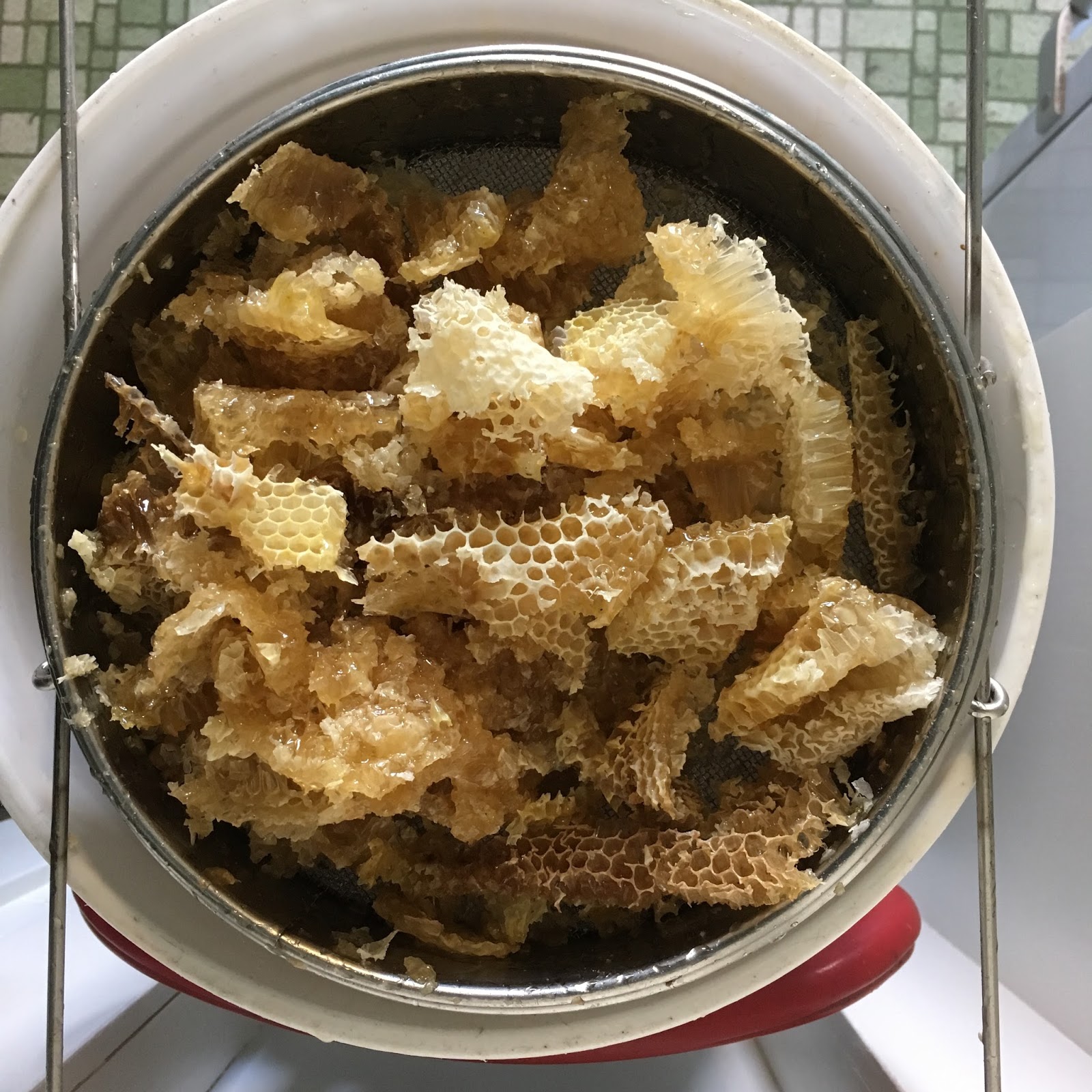 Since Robb and I live in a tiny house with limited storage, we do not own a centrifugal honey extractor.  We harvest our honey by cutting the honeycomb out of the wooden frames, cutting the comb apart, and letting it strain through a multi-tiered sieve.  I rather like the simplicity of it all.