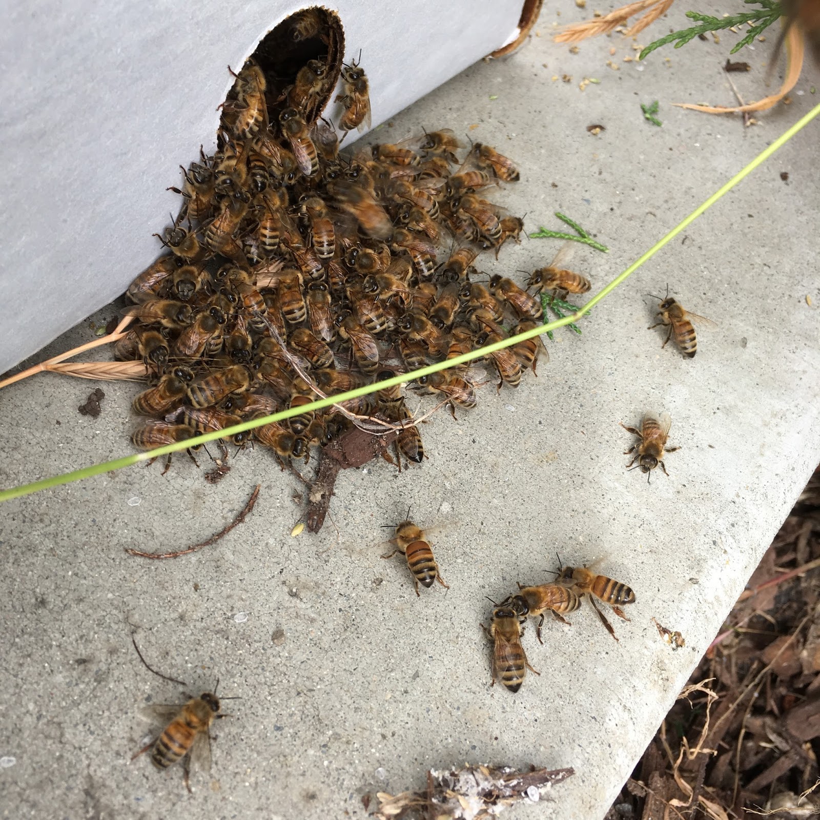 I called Jamaica who lives a few blocks away, and who is always up for a Bee Adventure.  She and I shook the bees into a specialized cardboard beehive, while the neighbors looked on.
