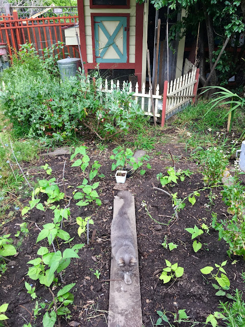 The beans I planted a few weeks ago are doing well.  It's a good thing that I have plenty of extra baby bean plants, because this bed is a magnet for all our animals.  The chickens keep escaping from their part of the garden, and tearing things up.  And the cats seem determined to nap on top of anything I plant.
