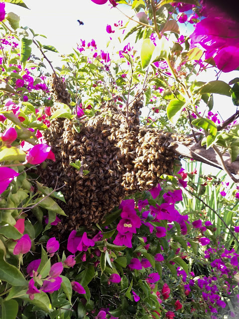 The bees, annoyingly, flew into the middle of our next door neighbor's impenetrable bottle brush tree, and stayed there for several hours.