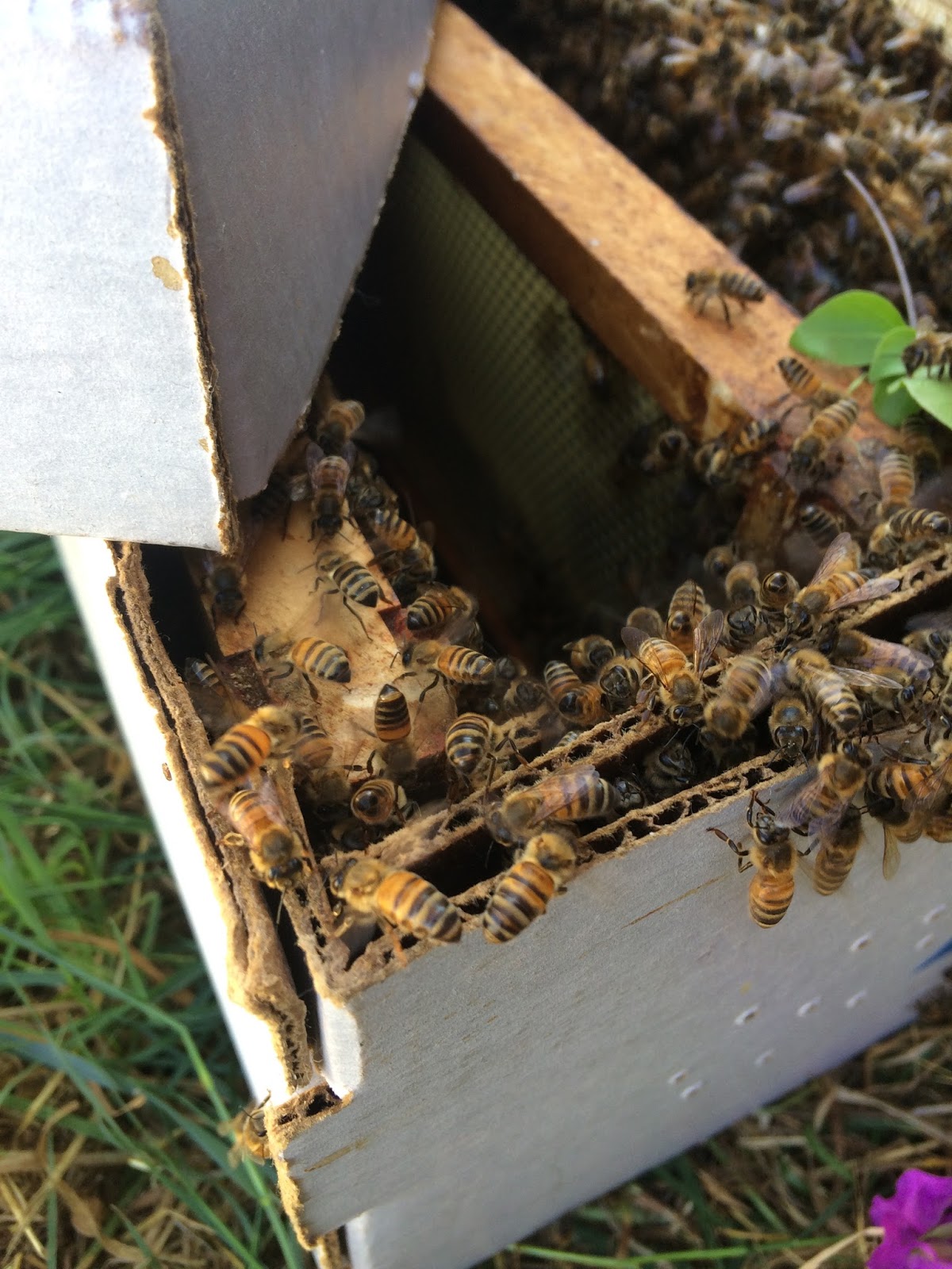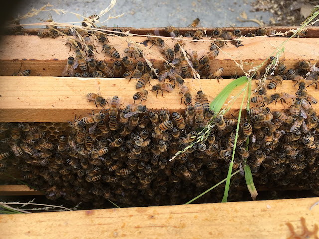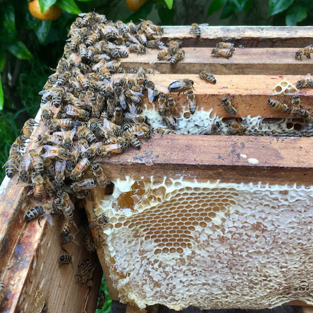Since the Alicia hive swarmed on Saturday, I thought I'd better have a look at the Lori bees.  The hive was jam-packed with honey, so I harvested four frames.  I interspersed empty frames between the honeycomb I'd left behind, hoping that this would deter the bees from building terribly irregular comb.  It's not that I'm obsessed with neatness, it's just that irregular comb gets damaged during hive inspections.  And I don't want to harm my bees.
